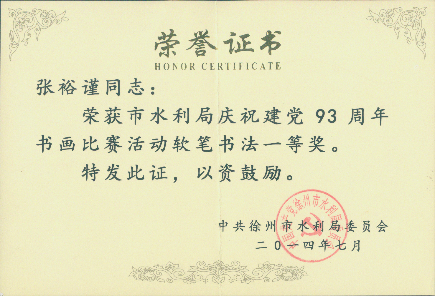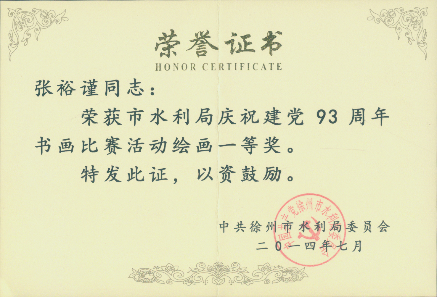 我院職工獲得市水利局“慶祝建黨93周年書畫比賽”一等獎
