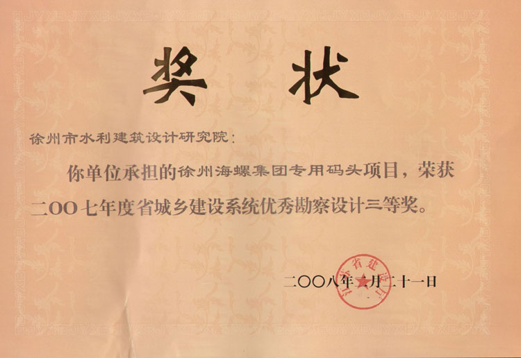 《海螺集團(tuán)碼頭》07年度省城鄉(xiāng)系統(tǒng)優(yōu)秀勘察設(shè)計(jì)三等獎(jiǎng)(2008.2)